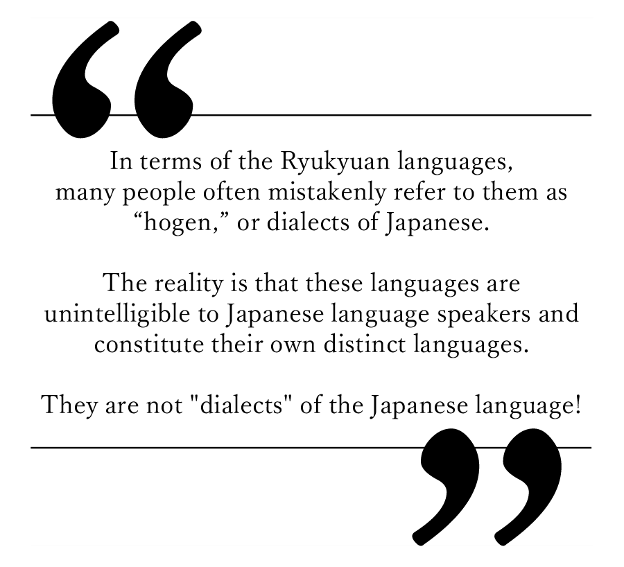 In terms of the Ryukyuan languages, many people often mistakenly refer to them as “hogen,” or dialects of Japanese. The reality is that these languages are unintelligible to Japanese language speakers and constitute their own distinct languages. They are not “dialects” of the Japanese language!