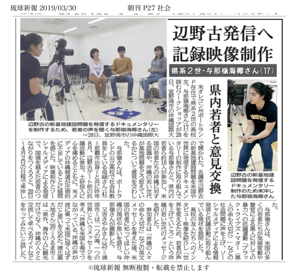 This article covered efforts by Portland high school student and GUA youth member Kaiya Yonamine, and her efforts to film and interview local Okinawan youth about their thoughts on the new US military base construction in Henoko, Okinawa. She connected the issue to the Black Lives Matter movement in the US, and stressed the importance of youth raising their voices. Some comments from the Okinawan youth present included statements related to how the message that there is “One ocean and one world” should be conveyed to people abroad, while another youth present voiced a desire to help people from outside the prefecture and the country to not only come to Okinawa for sightseeing, but to interact with Okinawans and to learn.