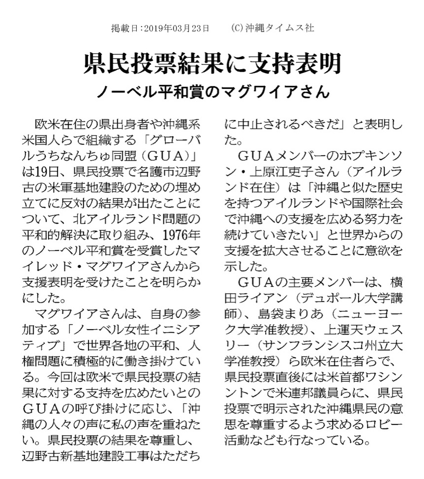 Okinawa Times article on March 23, 2019 Highlighting Recent GUA efforts