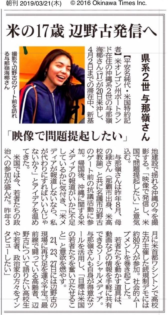 Okinawa Times article on March 21, 2019 on Kaiya Yonamine, GUA Youth Member