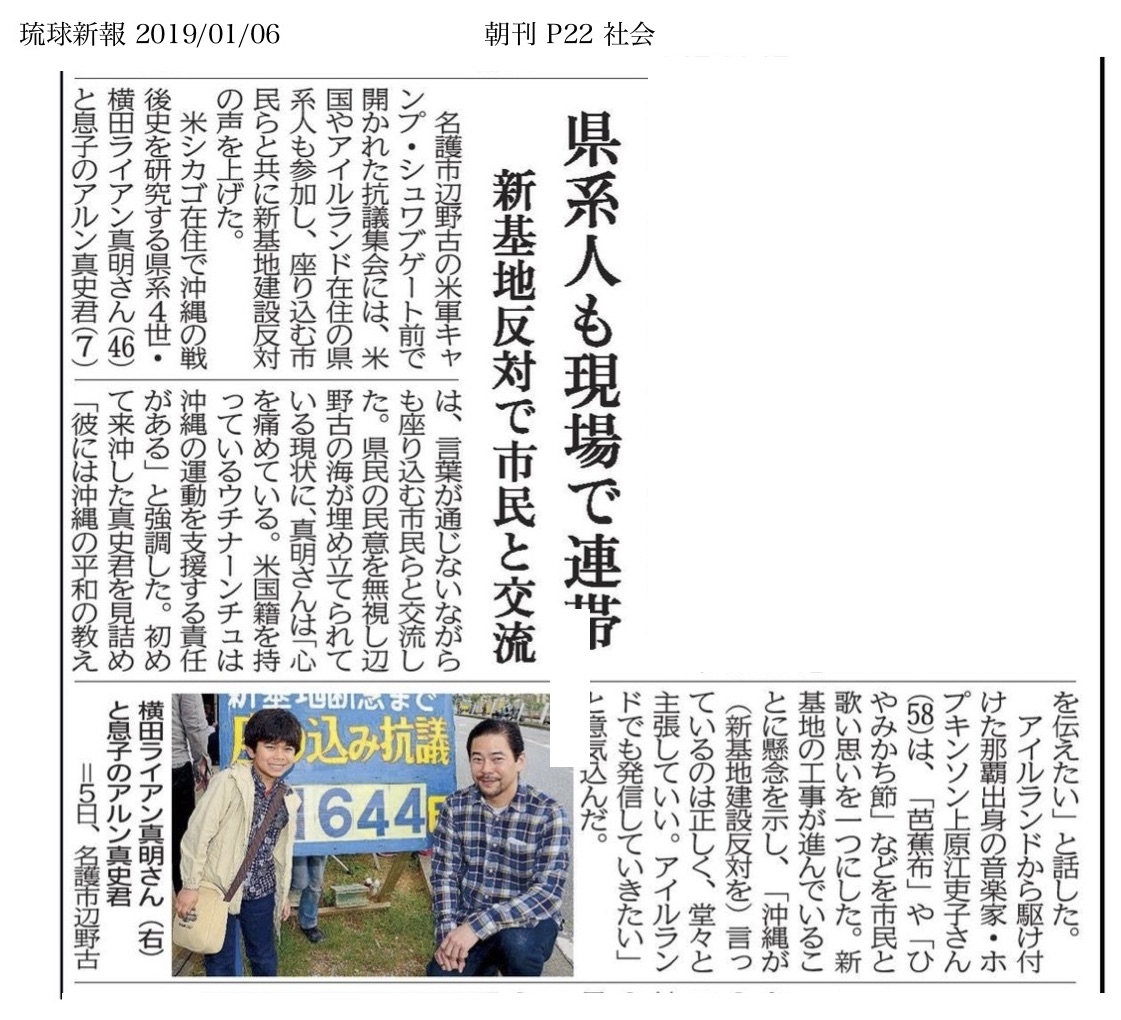 In this article, GUA member Ryan Yokota noted that diasporic Uchinanchu who have US citizenship have a responsibility to support the Okinawan people in their struggle, while GUA member Eriko Uehara Hopkinson stressed the importance of opposing the new base, and how she will work to support this work in Ireland, where she resides.